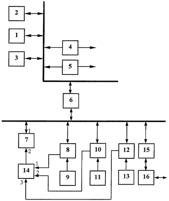 Устройство, изображенное на чертеже, содержит центральный процессор 1, осуществляющий управление всеми блоками устройства, контроллер системной шины 2, осуществляющий преобразование команд управления, полученных от центрального процессора, в сигналы, передаваемые блокам устройства по системной шине, а также управляющий процедурами обмена сигналами по системной шине между блоками устройства, а также между центральным процессором и блоками устройства, демультиплексор 3, осуществляющий выделение из состава полученного с выхода тюнера многопрограммного сигнала цифрового ТВ вещания выбранную абонентом ТВ программу, декодер видео 4, осуществляющий декомпрессию сигналов изображения, компрессированных в соответствии со стандартом MPEG-2 на передаче, декодер аудио 5, осуществляющий декомпрессию сигналов звукового сопровождения, компрессированных в соответствии со стандартом MPEG-2 на передаче, первый интерфейсный блок 6, обеспечивающий получение с системной шины данных о появлении на экране телевизионного приемника пользовательского меню управления бытовыми электронными устройствами, т.е. о начале осуществления абонентом программирования указанных устройств, процессор управления электронными бытовыми устройствами 7, получающий данные о командах управления бытовыми электронными устройствами, реализуемых абонентом с помощью экранного меню, и формирующий команды программирования электронных бытовых устройств, первый блок памяти 8, содержащий список типов программируемых бытовых электронных устройств, второй интерфейсный блок 9, с помощью которого осуществляется пополнение и изменение указанного списка типов программируемых электронных бытовых устройств, второй блок памяти 10, содержащий набор протоколов управления каждого из существующих электронных бытовых устройств (всех известных типов устройств всех известных производителей), третий интерфейсный блок 11, с помощью которого осуществляется пополнение и изменение указанного набора протоколов управления электронными бытовыми устройствами, третий блок памяти 12, содержащий список режимов и частотных диапазонов радиосвязи с электронными бытовыми устройствами, четвертый интерфейсный блок 13, с помощью которого осуществляется пополнение и изменение указанного списка режимов и частотных диапазонов, блок формирования команд 14, формирующий команды управления электронными бытовыми устройствами, пятый интерфейсный блок 15, получающий от процессора управления электронными бытовыми устройствами команды управления указанными устройствами, и радиомодем 16.