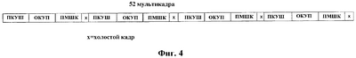 В первом представленном варианте выполнения новый ПМШК назначается в дополнение к тому же самому физическому каналу, что и ПКУШ и ОКУП. Этот подход иллюстрируется на Фиг.4. Фиг.4 представляет временной интервал, используемый для физического канала в последовательных кадрах из 52 мультикадров. Четыре следующих друг за другом кадра принадлежат соответствующему блоку. Физический канал разделяется между ПКУШ, ОКУП и ПМШК блок за блоком, причем каждый из этих каналов назначается временному интервалу в различные блочные периоды. Соответствующий временной интервал в кадре х называется холостым кадром. В принципе, возможно также назначение обычных КПД для этого физического канала. Необходимо учитывать, однако, что доступная остающаяся пропускная способность является совсем малой.