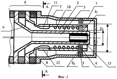 На фиг.1 показана схема катода, в котором соединение поджигного электрода 1 вблизи своего второго конца с узлом нагревателя 2 вблизи его второго конца выполнено посредством размещения между ними электроизолятора 5, а соединение узла 3 эмиттера вблизи своего второго конца с узлом нагревателя 2 вблизи его второго конца выполнено посредством размещения между ними электроизолятора 6. При этом узел нагревателя 2 вблизи своего второго конца соединен через электроизоляторы 5 и 6 с поджигным электродом 1 и узлом 3 эмиттера, соответственно. Подвижность каждого из данных соединений обеспечивается за счет установки электроизоляторов 5 и 6 с зазором по отношению к узлу нагревателя 2 и узлу 3 эмиттера, соответственно. Величина каждого зазора много меньше диаметра электроизоляторов 5 и 6, образующих этот зазор ( 11, 22), где 1 – зазор между электроизолятором 6 и узлом 3 эмиттера, 2 – зазор между электроизолятором 5 и узлом нагревателя 2, D21 – диаметр электроизолятора 6, D2 – диаметр электроизолятора 5.