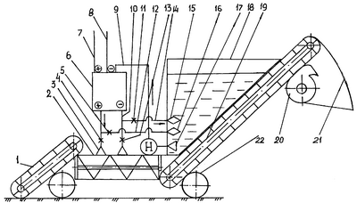 Для подачи исходного раствора из бака 8 в электроактиватор 5 насос 17 оборудован напорным трубопроводом 19. Рабочая камера 2 имеет герметическое соединение с выгрузным транспортером 20, который в верхней части имеет отбойный щиток 21, перед отбойным щитком 21 установлен вентилятор 22. Привод шнека рабочей камеры 2 выполнен от гидромотора 23, а привод перемещения тележки 24 осуществлен от дополнительного мотор-редуктора 25. Герметическое соединение рабочей камеры 2 с выгрузным транспортером 20 предназначено для передачи обработанных семян из рабочей камеры 2 на транспортер 20 без потерь воды.