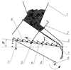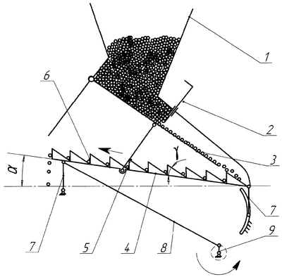 От механизма привода 9 через шатун 8 колебания определенной частоты и направленности передаются на дно 4, а от него через толкатель 5 на скатную доску 3. Частота, амплитуда и направленность колебаний задаются по полярной номограмме таким образом, чтобы за один цикл перемещение семян по каждой наклонной грани гребня 6 было на 10-20% больше ее длины. Колебания скатной доски 3 активизируют истечение семян из бункера 1 через щель, образованную регулируемой заслонкой 2. За счет угла установки скатной доски 3 не менее 27° семена самотеком ссыпаются по ее поверхности и попадают в нижнюю часть дна 4. Углы и выбраны такими, чтобы их сумма была больше оговоренных 27°, за счет чего предотвращается самопроизвольное перемещение семян вверх по гребнистой поверхности при произвольных случайных колебаниях дна 4. Семена движутся вверх по наклонным поверхностям гребней 6 только при заданных режимах и направленности колебаний. При движении по гребнистой поверхности дна 4 поток семян перераспределяется, становясь более равномерным. Перемещение и фиксация шарниров подвески 7 в пазах позволяет регулировать угол наклона дна 4 к горизонту, приспосабливая аппарат к высеву семян с различными физико-механическими свойствами.