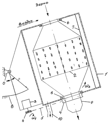 На чертеже представлено устройство для загрузки и предварительной очистки зерна. Стойка – 0, корпус бункера – 1, цилиндрическое решето – 2, электродвигатель – 3, шкивы – 4, гибкое звено – 5, подшипники – 6, щетки – 7, регулятор наклона корпуса бункера – 8, патрубок для схода неочищенной части зерна с примесями – 9, патрубок для выхода очищенного зерна – 10.