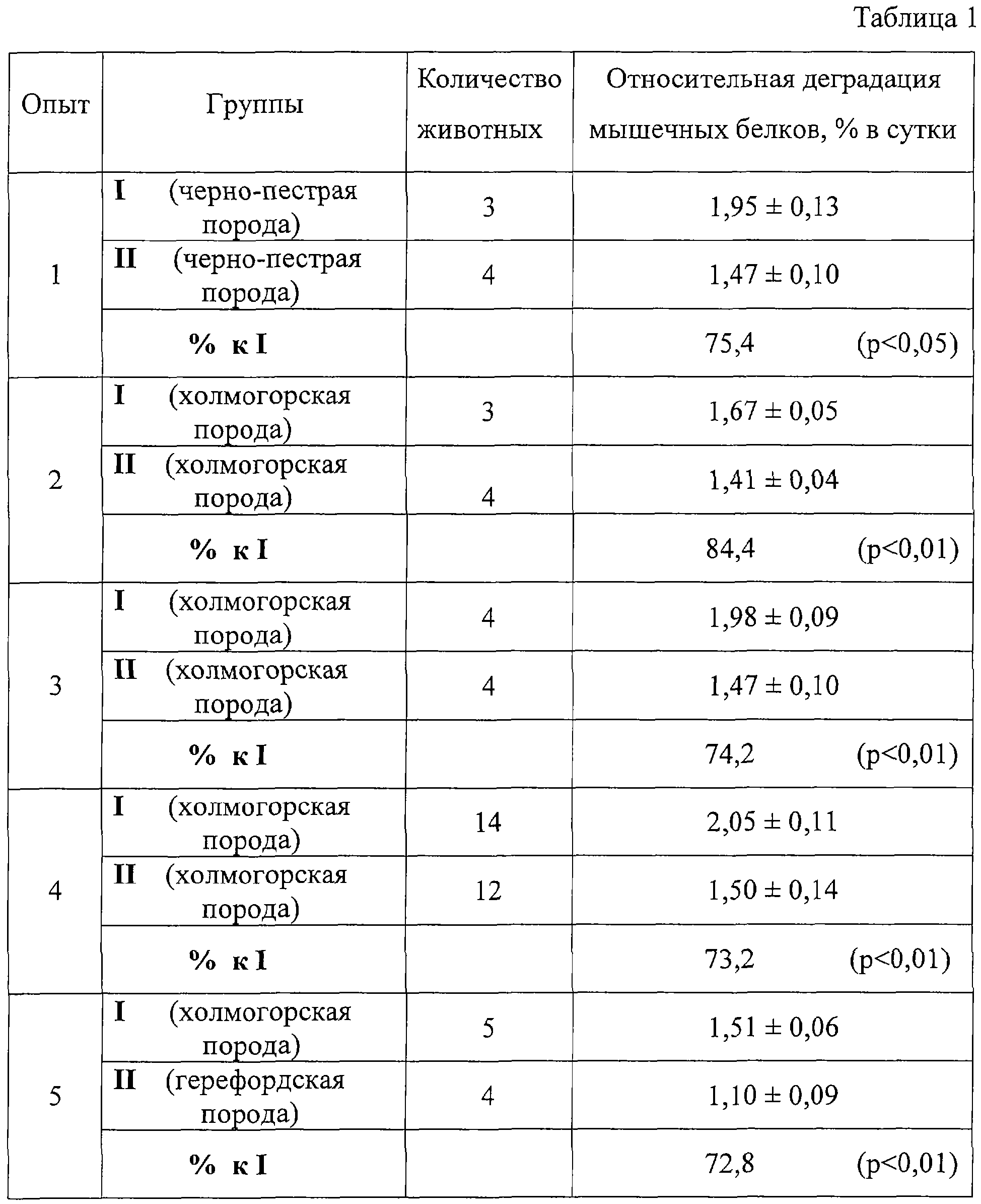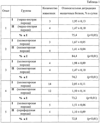 Способ выявления бычков с высоким потенциалом мясной продуктивности, отличающийся тем, что, с целью повышения точности способа, используют данные суточного выделения с мочой креатинина и 3-метилгистидина с последующим определением скорости отложения и деградации белков скелетных мышц, а оценку результатов осуществляют по относительной деградации мышечных белков, определяемой по формуле при этом бычков, имеющих значение относительной деградации белков 1,51-2,05% / сут, относят к животным с низким потенциалом мясной продуктивности, а со значениями 1,10-1,50% / сут – к бычкам с высоким потенциалом мясной продуктивности.