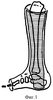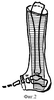 Под местной анестезией производят закрытую ручную репозицию перелома, накладывают гипсовую повязку “сапожок” и укрепляют ее U-образной лонгетой из полимерных бинтов. После ее отвердения она поэтапно укорачивается в области стопы (фиг.1).
