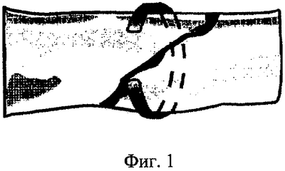 Устройство по ходу операции работает следующим образом. Проведена открытая репозиция выделенных отломков и в продольном направлении через линию перелома выполнен паз в кортикальном слое шириной 1,0-1,2 мм, длиной 20 мм. В линию с пазом симметрично по его краям на расстоянии 27 мм друг от друга просверлены отверстия для размещения отгибов остова на глубину, равную диаметру кости.