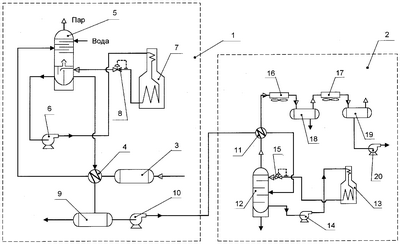 Установка 1 состоит из выветривателя 3, рекуперативного теплообменника 4, колонны 5, насоса 6, печи 7, регулятора 8, емкости 9 и насоса 10. Установка 2 состоит из рекуперативного теплообменника 11, выпарного аппарата 12, печи 13, насоса 14, регулятора 15, холодильников 16 и 17, емкостей 18 и 19 и насоса 20.