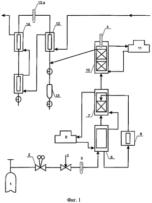 Принципиальная схема установки для испытания катализатора изображена на фиг.1, где 1 – баллон; 2, 3 – редуктор и система тонкой регулировки потока; 4, 13а – термометры; 5 – расходомер; 6, 7 – насытитель и насытительная колонка; 8 – перистальтический насос; 9, 11 – термостат; 10 – прямоточный каталитический реактор (ПР); 12 – холодильник; 13 – приемник конденсата; 14 – горелка. Водород с природным изотопным составом (147 пропромиллей дейтерия), насыщенный парами воды, обогащенной дейтерием (5-10 ат.%) и тритием (1·10-3 Ки/л), поступал снизу в слой катализатора, расположенный в термостатируемом реакторе, между двумя слоями гидрофильной насадки; температура в реакторе поддерживалась на 10-15 градусов выше температуры насыщения. На катализаторе протекает реакция изотопного обмена водорода с парами воды: