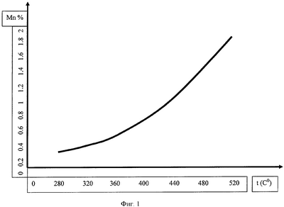 1. По экспериментально установленным графическим зависимостям (фиг.1, 2, 3, 4) на вертикальной оси выбирается количественный показатель входящих металлов магния, кремния, меди, марганца, затем на горизонтальной оси подбираются температуры. После этого температуры складываются и делятся на количество учитываемых металлов, входящих в алюминиевый сплав (в данном случае 4), таким образом, получаем рабочую температуру.
