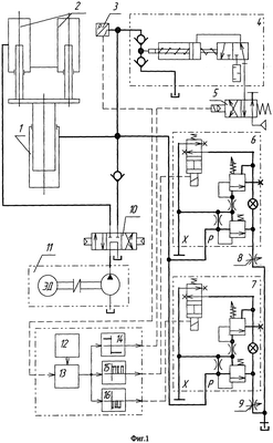 – выходы предохранительных клапанов соединены со сливной линией через регулируемые дроссели, а управляющие электромагниты предохранительных клапанов подключены к программному управляющему устройству;
