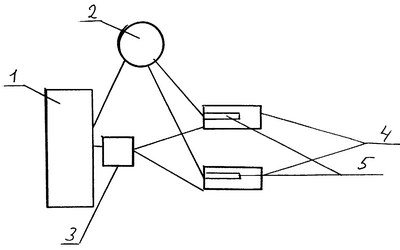 На чертеже схематично приведен вид предлагаемого движителя в базовом варианте реализации, при этом использованы следующие обозначения: паровой котел 1, паровая турбина 2, распределитель 3 паровых потоков, трубы 4 создания реактивного движения, перфорированные трубы 5.