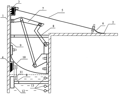 Уплотняющий затвор плавающих крыш резервуаров работает следующим образом. При вертикальных и горизонтальных подвижках плавающей крыши благодаря шарнирно-стержневой системе 7 и пружине сжатия 8 происходит плотное прижатие скользящего листа 9 с нижним 4 и верхним 3 вторичным уплотнением к стенке резервуара 1, в результате чего обеспечиваются высокая газоплотность затвора и очистка с помощью скребка 12 вертикальных стенок 1 резервуара, с дополнительной подчисткой стенки резервуара нижним вторичным уплотнением 4. При отрицательных температурах твердые остатки размягчают циркуляцией нагретого воздуха через кольцевые нагреватели 13, закрепленные на стенке плавающей крыши 2, кроме того, при вертикальных и горизонтальных подвижках плавающей крыши резинотканевая шторка 6, соединенная при помощи шпильки с защитным металлическим листом 5, перекрывает зазор между плавающей крышей 2 и защитным металлическим листом 5, предотвращая загрязнение внутренней полости затвора.