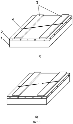 На фиг.1а представлено изображение структуры, состоящей из планарного затвора 1, изолирующего слоя 2, контактных дорожек 3, углеродной нанотрубки 4.