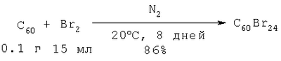 Изобретение относится к области органического синтеза, в частности к химии бромпроизводных фуллерена С60. Фуллерен является одной из аллотропных модификаций углерода и представляет собой полиэдрический (сферический) кластер, состоящий из 60 и более атомов углерода. [1. В.И.Соколов, И.В.Станкевич: Усп. химии. 62(5), (1993)]. Производные фуллерена широко применяются в качестве сверхпроводников, прочных углеродных пленок, материалов для нелинейной оптики, причем полезные свойства чаще всего проявляют производные фуллерена, полученные на основе химической реакции С60 с металлами, нестабильными органическими молекулами. По этой причине во всем мире развернуты широкие исследования химических превращений фуллеренов (В.И.Соколов, И.В.Станкевич: Усп. химии. 62(5), (1993)). Реакционная способность фуллеренов весьма необычна. Особенности поведения фуллеренов проявляются в самых простых химических реакциях: гидрировании, галогенировании, окислении и т.д. Ввиду наличия в молекуле большого количества двойных связей (следовательно, реакционных центров), взаимодействие фуллерена С60 со многими реагентами проходит неоднозначно и приводит к образованию смеси изомеров. Это свойство фуллерена ярко проявляется в синтезе галоидпроизводных, в частности, бромпроизводных фуллерена. Еще в 1991-1992 гг. было установлено, что фуллерен С60 взаимодействует с жидким бромом, давая сложные смеси продуктов присоединения С60Brn. В дальнейшем эти исследования не получили большого развития из-за трудности выделения индивидуальных соединений и контролирования процесса галогенирования [2. Е.Н.Караулова, Е.И.Багрий. Усп. химии. 62(5), (1993)]. Для того чтобы получить бромированные продукты с низким содержанием брома, реакция проводилась при соотношении брома к фуллерену 1÷3:1. Однако бромирование при такой концентрации реагентов не проходит. [3. R.Taylor, A.G.Avent, P.R.Birkeu, T.J.S.Dennis, J.P.Hare et al. Pure and Appl. Chem. Vol. 65, N 1, p.135, 1993]. И только при использовании значительного избытка брома фуллерены С60/С70 (смесь 85:15) или чистый С60 подвергаются бромированию жидким бромом при 20°С и 50°С до С60Brn (n=2-4), имеющих в ИК-спектре поглощение при 515-545 см-1, характерное для связи С-Br. [4. G.Olah, J.Bucsi, C.Lambert, R.Aniszfeld, N.J.Trivedi et al. J. Am. Chem. Soc., V.113, p.9385, 1991]. Выходы полученных продуктов и конверсия исходных фуллеренов С60/С70 в работе не указаны. Фуллерен С60 хорошо растворим в CS2 и проведение бромирования избытком жидкого брома в этом растворителе приводит к образованию темно-коричневых кристаллов с выходом 80%. Согласно данным рентгеноструктурного анализа это соединение является 1, 3, 6, 11, 13, 18, 28, 31-октабромфуллереном-С60. Бромирование фуллерена С60 в бензоле или CCl4 дает красные кристаллы в форме пластин, структура которых определена как 1, 6, 9, 12, 15, 18-гексабромфуллерен-С60. Этот же продукт был получен при проведении реакции и в хлороформе [5. F.N.Tebbe, R.L.Harlow, D.B.Chase, D.L.Thorn, G.C.Campbell et al. Science V.256, p.882, 1992; 6. P.P.Birkett, P.B.Hitchcock, H.W.Kroto, R.Taylor, D.R.M.Walton. Nature V.357, p.479, 1992]. Обработка фуллерена С60 жидким бромом завершается образованием продукта состава С60Br24 в виде кристаллов желто-оранжевого цвета. Реакция бромирования обратима. Полибромиды фуллерена легко элиминируют бром, превращаясь в дибромиды (С60Br2) и тетрабромиды (С60Br4) [5]. Недостатки метода: 1. Метод нетехнологичен, неудобен и сложен в аппаратурном оформлении. 2. Бром является агрессивным, ядовитым соединением, особенно при повышенно