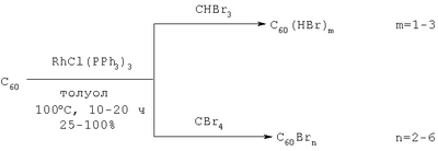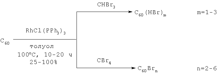 Способ получения бромпроизводных фуллерена С60, отличающийся тем, что в качестве бромирующих агентов используют тетрабромметан CBr4 или бромоформ CHBr3, которые вступают в реакцию с фуллереном С60 в присутствии родийсодержащего катализатора – комплекса Уилкинсона [RhCl(PPh3)3], причем мольное соотношение катализатора, фуллерена и бромирующего агента составляет 1:100:100÷500, реакцию проводят при температуре 100°С в течение 10-20 ч.