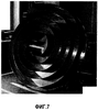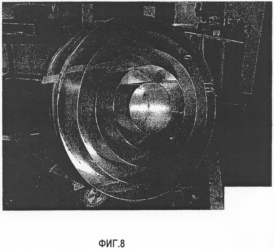 Для непрерывного промышленного процесса барабан может состоять из набора нескольких концентричных суббарабанов, установленных один над другим, при этом таблетки через отверстия проходят от одного суббарабана к другому. Такое устройство изображено на фиг.4, где стрелками показан путь таблеток. В этом варианте таблетки проходят от верхнего суббарабана к нижнему суббарабану, затрачивая определенное время пребывания в верхнем суббарабане, и так далее. Такая циркуляция благодаря лучшему разделению таблеток по их плотности дает возможность уменьшить распределение таблеток по крупности частиц. Кроме того, значительное увеличение пути перемещения дает возможность увеличить время пребывания и, следовательно, оптимизировать объем таблетирующей машины относительно массы, производимой за единицу времени. Следовательно, такой смеситель содержит направляющие перегородки для образующихся таблеток, так чтобы как можно больше избежать смешивания таблеток на ранней стадии формования с таблетками на завершающей стадии формования. Такой смеситель обеспечивает одинаковую частоту галтовки (в зависимости от частоты вращения смесителя) для поступающей рубленой пряжи и для покидающих устройство таблеток. Даже если все содержимое смесителя подвергается галтовке при одинаковой частоте, то, как оказалось, подвергающиеся галтовке предметы, однако, распределяются в данном случае по разным радиусам, а окружная скорость изменяется на каждой ступени. Следовательно, смеситель должен иметь такие размеры и действовать таким образом, чтобы галтовке предметов на больших диаметрах не препятствовала центробежная сила и чтобы предметы на малых диаметрах вращались достаточно быстро, чтобы они могли подвергаться галтовке. Следовательно, это устройство обеспечивает галтовку посредством перемешивания, при этом частота галтовки в каждый момент времени является одинаковой для рубленой пряжи (поступающей) и таблеток, включая образующиеся таблетки и покидающие устройство таблетки. В этом варианте, который может быть использован для непрерывного производства, частота галтовки обычно поддерживается постоянной. На фиг.7 и 8 показаны варианты чаши. На фиг.7 показана спиральная чаша со спиральной перегородкой, параллельной оси вращения чаши и прикрепленной к ее основанию. Образующиеся таблетки следуют по спиральному пути, определяемому перегородкой. Таблетки помещают в середину и выводят на периферии. На фиг.8 показана чаша, содержащая ряд концентричных перегородок, параллельных оси вращения указанной чаши, при этом отверстия в указанных перегородках позволяют образующимся таблеткам перемещаться из одного пространства между двумя перегородками в соседнее пространство. Это прохождение из одного пространства в следующее пространство происходит в направлении от центра к периферии.