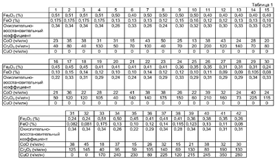 Стекла по примерам 1, 11, 18 и 30 представляют собой примеры, осуществленные согласно изобретению, композиции которых были измерены, тогда как стекла других примеров даны с их теоретическими составами. Приведенные различные примеры показывают, что в широкой гамме красящих агентов композиции согласно изобретению позволяют получить синие стекла, удовлетворяющие ограничениям по общему светопропусканию (TLА>60%) и, кроме того, обладающие селективностью, по меньшей мере равной 1,1 (таблицы 2-4). Примеры 1-42, осуществленные согласно изобретению, показывают, что можно получить стекла, имеющие желаемую синюю окраску, то есть длину волны, находящуюся в интервале от 485 до 490 нм, и чистоту, меньше или равную 13%, при сохранении высокого светопропускания (больше 60%) и селективности, по меньшей мере равной 1,1. Указанные хорошие свойства стекол проистекают из сочетания красящих агентов в форме оксидов железа, кобальта, никеля и, в известных случаях, меди. Примеры показывают также, что намеченные оптические характеристики могут быть достигнуты с относительно низким содержанием железа (меньше или равным 0,51%), что является особенно выгодным, когда речь идет о применении состава в установках для изготовления бесцветного стекла, действующих по “флотационному” способу. Стекла, полученные исходя из композиций согласно изобретению, совместимы с обычными методами изготовления листового стекла. Толщина стеклянной ленты, получаемой в результате образования слоя расплавленного стекла на ванне с оловом, может варьировать от 0,8 до 10 мм, предпочтительно, от 3 до 5 мм для автомобильных стекол и от 5 до 10 мм для стекол, предназначенных для применения в строительстве. Стекло, полученное резкой стеклянной ленты, впоследствии может быть подвергнуто операции выгибания, в частности, когда дело касается автомобильного стекла. Равным образом, оно может быть подвергнуто другим последующим операциям обработки, например, направленным на то, чтобы покрыть его одним или несколькими слоями оксидов металлов с целью уменьшить его нагрев солнечным излучением и, следовательно, уменьшить нагрев салона автомобиля, оборудованного таким стеклом.