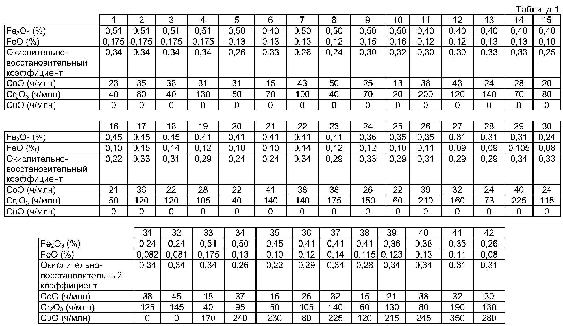 Здесь условливаются, что композиция кремниево-натриево-кальциевого стекла может содержать, помимо неизбежных примесей, небольшую долю (до 1%) других компонентов, например добавок, помогающих при варке или при осветлении стекла (SO3, Cl, Sb2O3, As2O3), или происходящих из возможной добавки стеклобоя, возвращаемого в стеклующуюся смесь. В контексте изобретения под “окислительно-восстановительным коэффициентом” подразумевают отношение массового содержания оксида двухвалентного железа, выраженного в форме FeO, к общему массовому содержанию железа, выраженному в форме оксида Fe2O3. Всегда в том же самом контексте определяют “селективность” как отношение светопропускания при освещении А (TLA) к полному энергетическому пропусканию (ТЕ) при данной толщине. Композиция согласно изобретению позволяет получить стекло высокой чистоты, окрашенное в синий цвет, даже при значительном уровне светопропускания. Кроме того, стекло, полученное на основе композиции согласно изобретению, обладает высокой селективностью, что является особенно выгодным, когда оно предназначено для изготовления автомобильного стекла или строительного стекла. В самом деле, с таким стеклом ограничивают нагрев, связанный с солнечным излучением, и, благодаря этому, увеличивают тепловой комфорт для людей, находящихся в здании или в автомобиле. Предпочтительно, селективность стекла больше или равна 1,4 и, предпочтительно, больше или равна 1,4. Состав согласно изобретению кажется выгодным для получения стекол, которые при толщине, варьирующей от 3 до 5 мм, обладают светопропусканием TLА по меньшей мере равным 60%, предпочтительно, 70%, и, таким образом, пригодны для изготовления боковых, задних и ветровых стекол для автомобилей. Предпочтительно, стекло согласно изобретению обладает чистотой возбуждения меньше 9% и, предпочтительно, больше 4%. Предпочтительно, доминирующая длина волны стекла, полученного благодаря составу согласно изобретению, по меньшей мере равна 487 нм. Предпочтительно, композиция стекла согласно изобретению имеет содержания оксида хрома и оксида кобальта, которые удовлетворяют соотношению: 100xCr2O3/(СоО)2>7 Применение красящих агентов в пределах изобретения позволяет как нельзя лучше подобрать оптические характеристики стекла и придать ему желаемую синюю окраску. Как уже было сказано перед этим, добавка оксида кобальта в композицию, содержащую железо, придает стеклу синюю окраску, но приводит также к уменьшению светопропускания. Таким образом, необходимо контролировать содержание оксида кобальта для того, чтобы светопропускание стекла оставалось совместимым с применением, для которого оно предназначено. В большинстве случаев содержание оксида кобальта варьирует от 15 до 40 ч/млн, предпочтительно, от 20 до 35 ч/млн. Присутствие железа в композиции стекла может проистекать из исходных продуктов, в качестве примесей, или из добавки определенного назначения. Известно, что если увеличить содержание железа, стекло приобретает зеленую окраску и его светопропускание уменьшается. Наоборот, уменьшение содержания железа, в частности в форме ионов двухвалентного железа, ухудшает характеристики с точки зрения энергетического пропускания, не затрагивая светопропускание. Предпочтительно, общее содержание железа в композиции больше 0,30%, предпочтительно, больше 0,40% и, бол