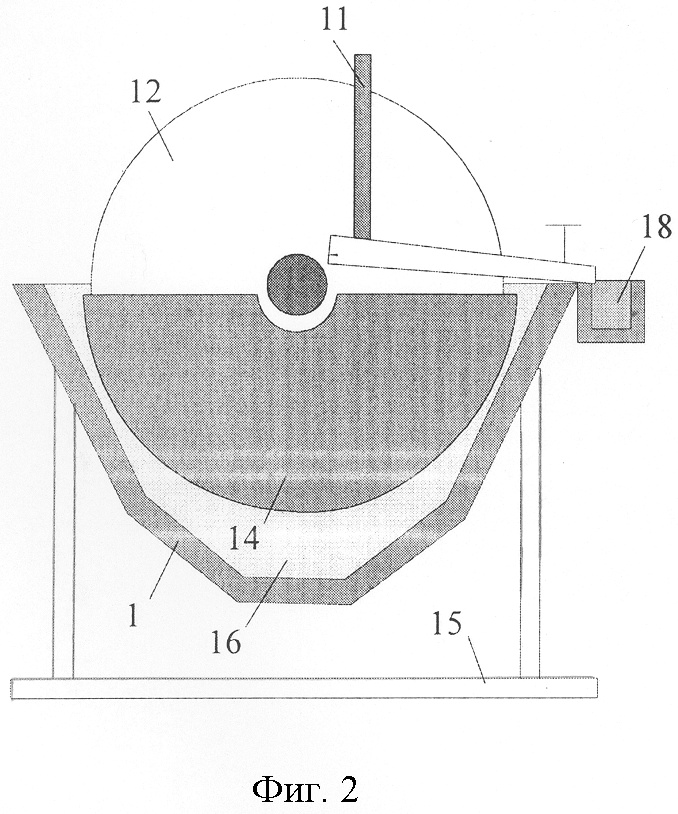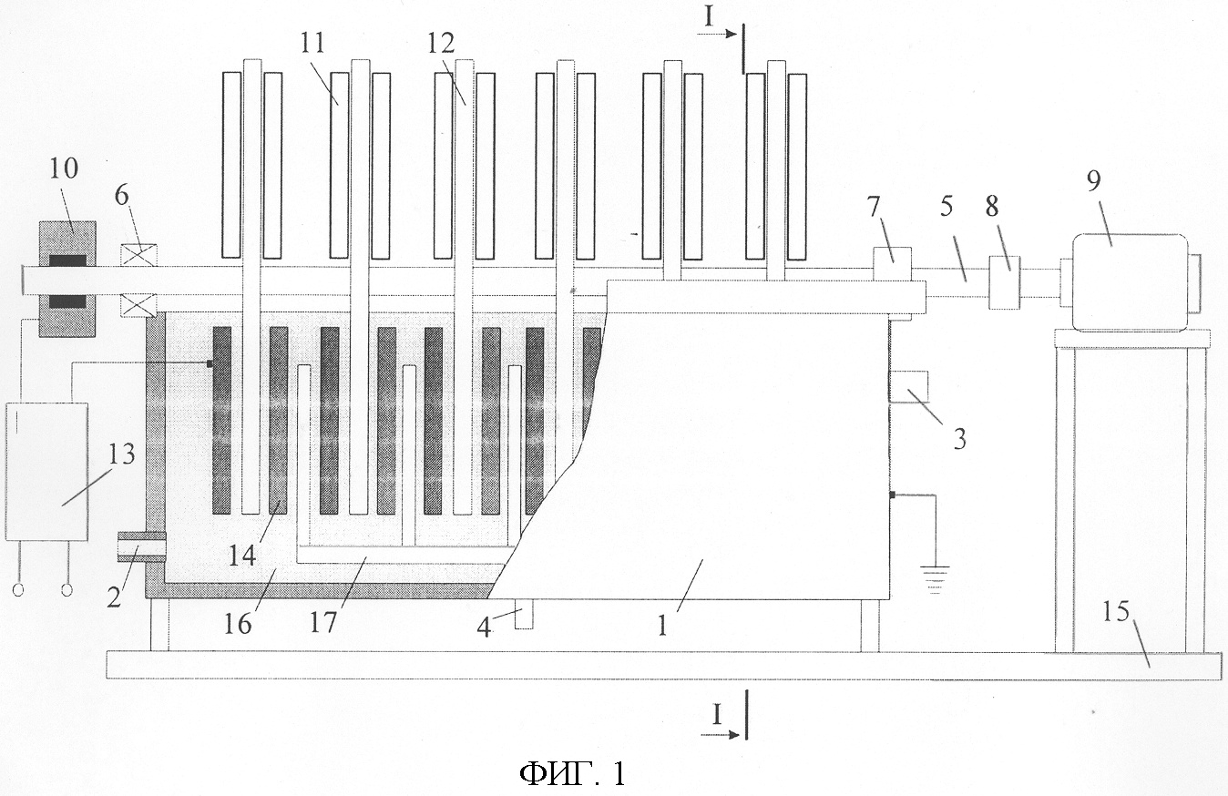Устройство, имеющее в качестве анодов n дисков, а в качестве катодов – 2n полудисков, изображено на фиг.1 и 2, где: 1 – электролизная ванна, 2 – отводящий патрубок, 3 – подводящий патрубок для раствора солей гуминовых кислот, 4 – сливной патрубок, 5 – вал, 6, 7 – подшипники, 8 – муфта, 9 – привод, 10 – токопроводящее средство, 11 – средство дл удаления целевого продукта с поверхности анода, 12 – анод, 13 – источник постоянного напряжения, 14 – катод, 15 – рама, 16 – исходный раствор солей гуминовых кислот и угольная взвесь, 17 – сопло для подачи пара, 18 – сливной желоб.