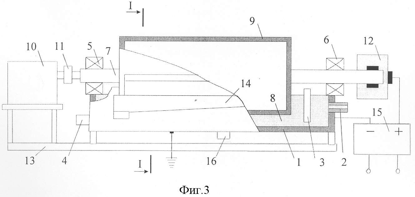 Электролизная ванна – катод 1 (фиг.3) выполнена в форме цилиндрического желоба с торцевыми стенками, на которых расположены подводящий и отводящий патрубки 2 и 4. Возможно расположение подводящего и отводящего патрубков на цилиндрической поверхности ванны 1 один напротив другого (не показано). В днище ванны 1 имеется сливной патрубок 16 для удаления осадка, образующегося в электролите при осуществлении электролиза и представляющего собой нерастворимые примеси исходной соли гуминовых кислот. В ванне на валу 7 коаксиально с зазором 8 установлен барабан-анод 9. Левый и правый концы вала 7 опираются на подшипники 5 и 6 (выполненные, например, из диэлектрического материала), обеспечивающие возможность вращения вала 7. Одним концом вал 7 соединен посредством муфты 11 (выполненной, например, из диэлектрического материала) с приводом 10, число оборотов которого может регулироваться. На другом конце вала 7 установлено токоподводящее средство 12, соединенное с положительным полюсом источника постоянного напряжения 15. Средство 12 обеспечивает подвод тока на анод-барабан 9 через вращающийся вал 7. Ванна 1, установленная на раме 13, соединена с отрицательным полюсом источника постоянного напряжения 15 и заземлена.