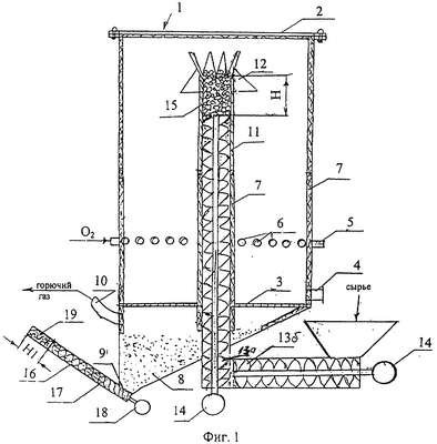 Часть вертикального шнека 13а установлена внутри транспортного канала 11, при этом вертикальный шнек 13а не доходит до верха транспортного канала 11 на уровень Н. Уровень Н должен быть достаточным для того, чтобы при рабочей загрузке сырья, вверху транспортного канала 11 образовалась из загружаемого сырья пробка 15, которая обеспечивает газонепроницаемость транспортного канала 11.