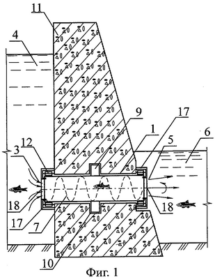 Рабочий расход воды, поступающий из верхнего 4 бьефа, создает благоприятные гидравлические условия внутри рыбоходного тракта 1 и для привлечения рыб к входному оголовку 5 на фоне потока нижнего б бьефа. Рыба, ориентируясь на привлекающий рыбу «шлейф» скоростей, заходит в вплывное отверстие 18 рыбоходного тракта 1 и начинает постепенно перемещаться в направлении верхнего 4 бьефа и, постепенно преодолевая вплывные отверстия 8, сформированные элементами усиленной шероховатости 7, выполненными в виде гибких стержней 16 и расположенными на внутренней поверхности напорного водовода 2 в виде лопастей шнека, по всей длине рыбоходного тракта 1 достигает выходного оголовка 3, где выходит в верхний 4 бьеф (фиг.1).