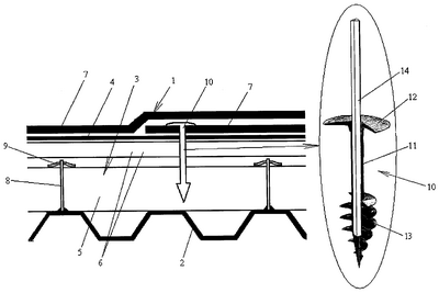 На подготовленное основание кровли – профилированный металлический настил 2 – привариваются металлические крепежные стержни 8, после чего на них укладывается и закрепляется крепежными пластинами (шайбами 9) первый слой плит «Пеноплэкс». Затем укладываются следующие слои утеплителя «Пеноплэкс» до набора требуемой расчетной величины (толщины), нанизываясь на выходящие концы приваренных крепежных стержней. Поверх уложенных слоев утеплителя укладывается разделительный (конденсатоотводящим) фильтрующий слой 4 (геотекстиль), и однослойный водоизоляционный ковер 1, после чего производится крепление водоизоляционного ковра, разделительного фильтрующего слоя и верхних слоев утеплителя специальными механическими пластиковыми крепежными элементами 10, винтовая часть которых закрепляется в слое утеплителя, закрепленном на приваренных металлических крепежных стержнях.
