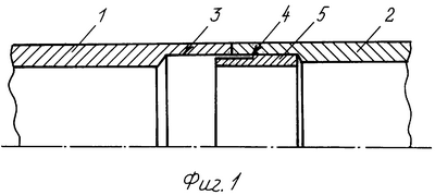 На концах соединяемых деталей – ниппеля 1 (трубчатая деталь) и трубы 2 (с толщиной стенки 6 мм) сварного соединения наружным диаметром 63,5 мм (см. Фиг.1) выполняют расточки 3 и 4 длиной 20 мм и толщиной 4,0 мм в сечении расточенных концов, в которых устанавливают цилиндрическую втулку длиной 25 мм (соотношение с длиной расточки – 1,25) и толщиной стенки 3 мм (соотношение с толщиной стенки в сечении проточки – 0,75). Втулку одним концом устанавливают на прессовой посадке в расточке 4 трубы 2, а вторым – на скользящей, т.е. с зазором, в расточке 3 ниппеля 1. Трубу 2 неподвижно устанавливают в захвате сварочной машины ПСТ 60, а другую трубчатую деталь ниппель 1 – в патроне шпинделя. Торец трубчатой детали 1 (ниппель) подводится к торцу неподвижной трубы 2 и приводится во вращение с частотой 1000 об/мин. При этом происходит разогрев сопрягаемых торцов деталей, после чего прикладывают осевое усилие сжатия (проковки). Образуется грат, который благодаря наличию цилиндрической втулки 5 полностью вытесняется наружу. В момент окончания сварки специальное устройство, установленное в захвате машины, перемещается к сварному соединению и срезает еще не остывший наружный грат. Затем производят нормализацию сварного соединения и поверхностную закалку трубы, включая сварное соединение, на глубину 2 мм, что составляет 50% от толщины стенок расточенных концов ниппеля и трубы.