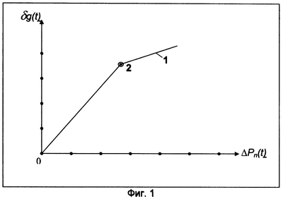 Поэтому, если график 1 (фиг.1) – прямая линия, то констатируют газовый режим разработки данного участка месторождения. При нарушении прямолинейности, появлении точки излома 2 графика 1 фиксируют в данный момент времени смену режима.