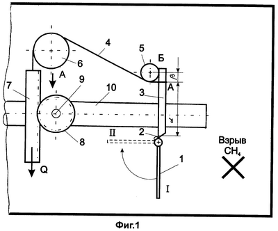 Устройство для автоматического открывания противопожарного трубопровода работает следующим образом. При взрыве метана или угольной пыли в шахте взрывная волна отклоняет флажок – индикатор взрыва 1 от вертикального положения (положение II). В результате чего груз Q под собственным весом перемещает зубчатую рейку 7 с гравитационным грузом вниз, поворачивая тем самым шпиндель вентиля на несколько оборотов (или пробку крана на угол 90°), в результате чего вода из противопожарного трубопровода поступает в горную выработку.