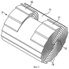 Свободное пространство 11 в сотовой структуре сотового элемента можно получить различными путями, например в металлических листах до или же после их набора в пакет, соответственно свертывания в рулон можно выполнить отверстия, для чего могут использоваться все известные методы обработки удалением части материала, например электроэрозионная прошивка, лазерная резка, водоструйная резка или иной метод. Помимо этого при формировании сотовой структуры 3 из различных пакетов металлических листов по меньшей мере один из таких пакетов металлических листов можно разрезать или разделить на две части в осевом направлении. Пример подобного разделения пакета металлических листов на две части показан на фиг.5. Сотовая структура 3 сотового элемента образована совместным свертыванием в рулон трех пакетов, каждый из которых набран из множества попеременно чередующихся гладких металлических листов 14 и гофрированных металлических листов. Для упрощения на чертеже показаны только гладкие металлические листы 14. В рассматриваемом примере сотовая структура 3 образована тремя пакетами металлических листов, совместно и единообразно свернутых в рулон. Пакет 15 металлических листов разделен в осевом направлении на первый полупакет 16 и второй полупакет 17, которые в осевом направлении отстоят друг от друга с образованием между ними свободного пространства 11, служащего для размещения в нем не показанного на чертеже датчика. Подобный подход позволяет простым путем создать в сотовой структуре свободное пространство 11 без необходимости выполнения, например, дополнительной технологической стадии обработки уже свернутых в рулон пакетов металлических листов.