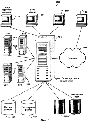 фиг.1 – система, которая реализует или использует систему управления бизнес-процессом предприятия, согласно по меньшей мере одному примерному варианту осуществления изобретения,