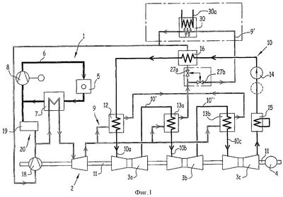 Газовая турбина 2 и паровые турбины 3а, 3b и 3с, все установленные на валу 11 (или при необходимости на первом и втором валах, как описано выше), обеспечивают привод компрессора 18 помимо привода ротора генератора 4 переменного тока. Энергия, забираемая компрессором для обеспечения сжатия второй текучей среды – теплоносителя со степенью сжатия от 1,5 до 3, является лишь малой частью энергии, вырабатываемой газовой турбиной и паровыми турбинами, так что энергия, получаемая генератором 4 переменного тока, не намного ниже общей энергии, вырабатываемой установкой.