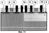 На фиг.9 показана полупроводниковая структура после осаждения слоя оксида кремния и проведения процесса химико-механической полировки слоя оксида кремния (изолирующего диэлектрика), где: 1 – кремниевая полупроводниковая пластина первого типа проводимости, 2 – карман в виде области полупроводника второго типа проводимости, 4 – слой резиста, 5 – слой поликристаллического кремния электродов полевых затворов, 6 – слой подзатворного диэлектрика, 7 – диффузионные области стоков, истоков и охранных зон одного типа проводимости, с низкой концентрацией примеси, 8 – диффузионные области стоков, истоков и охранных зон другого типа проводимости, с низкой концентрацией примеси, 9 – слой оксида кремния для создания разделительной зоны между областями стоков, истоков и охраны, 9а – пристеночный диэлектрик на боковых поверхностях электродов полевых затворов, 10 – диффузионные области стоков, истоков и охранных зон одного типа проводимости, с высокой концентрацией примеси, 11 – диффузионные области стоков, истоков и охранных зон другого типа проводимости, с высокой концентрацией примеси, 12 – слой оксида кремния (изолирующего диэлектрика).