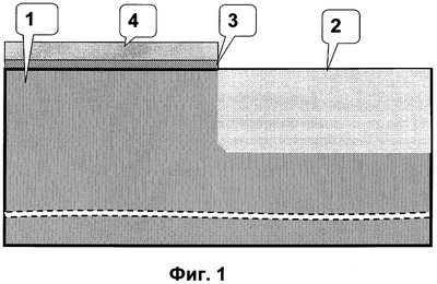На фиг.1 схематически показан разрез полупроводниковой структуры взаимодополняющих МДП ИС после формирования на поверхности полупроводниковой пластины первого типа проводимости областей кармана второго типа проводимости, где: 1 – кремниевая полупроводниковая пластина первого типа проводимости, 2 – карман в виде области полупроводника второго типа проводимости, 3 – слой оксида кремния, 4 – слой резиста.