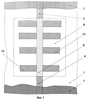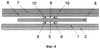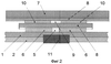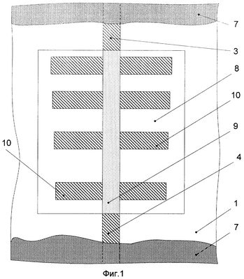 Другой пример конкретной реализации предложенного устройства (см. фиг.3, 4) содержит плату в виде пластины 1 из диэлектрического материала, на нижней стороне которой расположен электропроводный экран 2, а на верхней стороне – входная 3 и выходная 4 микрополосковые линии из электропроводного материала, поглощающий слой 5 из резистивного материала (например, поглощающего энергию СВЧ электромагнитных колебаний) с подключенными параллельно элементами 6 из электропроводного материала, причем поглощающий слой 5 гальванически включен между входной 3 и выходной 4 микрополосковыми линиями, а также содержит дополнительный электропроводный экран 7, причем над платой в виде пластины 1 размещены с зазором друг над другом N, где N – натуральный ряд чисел, дополнительных пластин 8 из диэлектрического материала с коэффициентом теплопроводности больше, чем коэффициент теплопроводности материала платы 1 (например, две пластины (N=2), при этом N ограничено таким образом, чтобы высота всех пластин не превысила ширину устройства), а также между N дополнительными пластинами – N-1 дополнительных поглощающих слоев 9 из резистивного материала (например, один слой (N-1=1)) с подключенными параллельно дополнительными элементами 10 из электропроводного материала, гальванически включенных между входной 3 и выходной 4 микрополосковыми линиями, причем все поглощающие слои 5, 9 с подключенными параллельно элементами 6, 10 расположены в зазорах между пластинами 1, 8, причем расположенные в зазорах элементы 6, 10 выполнены прерывистыми (например, каждый элемент выполнен в виде прерывистой полосы, величина прерываний и ширина полосы менее ширины микрополосковой линии 3 и уменьшаются в направлении от концов (микрополосковых линий 3, 4) к середине устройства) и примыкающими к боковым кромкам поглощающих слоев 5, 9, элементы 6, 10 выполнены из электропроводного материала с температурой плавления ниже, чем температуры плавления резистивного материала и электропроводного материала микрополосковых линий, причем дополнительный электропроводный экран 7 выполнен нанесенным на верхнюю поверхность N-й дополнительной пластины из диэлектрического материала (например, второй пластины) и имеет толщину и теплоемкость более толщины и теплоемкости N-й дополнительной пластины из диэлектрического материала.