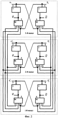 Предполагается, что каналы RS-триггера 1-й, 2-й…i-й, i – 3, 5, 7 … являются идентичными (фиг.1). Сигнал частоты f (или тактирования для регистров) поступает на вход каждого канала. В случае прохождения помехи или обрыва входа сигнала f, например на канал 1, за счет связи синхронизации каналов на выходе всегда будет правильная информация.