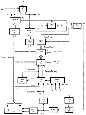 На чертеже приведена функциональная схема предлагаемого ЦПУ, которая содержит: двухфазный датчик угла (ДУ) 1, первый и второй двухполярные функциональные цифроаналоговые преобразователи (ФЦАП1 и ФЦАП2) 2 и 6, управляемый аналоговый инвертор (УАИ) 3, вычитающий усилитель (ВУ) 4, первый и второй блоки n-разрядных цифровых инверторов (БЦИ1 и БЦИ2) 5 и 7, цифроаналоговый преобразователь (ЦАП) 8, перепрограммируемое запоминающее устройство (ППЗУ) 9, оперативное запоминающее устройство (ОЗУ) 10, одновибратор (Однов.) 11, аналого-цифровой преобразователь (АЦП) 12, формирователь опорных напряжений переменного и постоянного тока (ФОН) 13, интегратор (ИНТ) 14, усилитель-формирователь (УФ) 15, реверсивный n-разрядный двоичный счетчик (РСЧ) 16, формирователь управляющих сигналов (ФУС) 17, корректирующее звено (Корр) 18, демодулятор (Д) 19, шину управления перепрограммируемым запоминающим устройством (УПР.ППЗУ) 20, шину управления оперативным запоминающим устройством (УПР.ОЗУ) 21 и шину контроль 22.