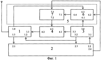 Низкочастотный выход 1.3 приемника 1 соединен с входом 2.1 обнаружителя сигнала 2. Выход 2.2 обнаружителя сигнала 2 соединен с входом 3.1 формирователя управляющих сигналов 3. Выход временных отсчетов 2.4 обнаружителя сигнала 2 соединен с входом временных отсчетов 6.2 блока расчета интенсивности перехода с частоты на частоту 6 и с входом временных отсчетов 7.3 блока расчета вероятности использования частоты 7. Выход 3.2 формирователя управляющих сигналов 3 соединен с входом 2.3 обнаружителя сигнала 2 и входом 1.2 приемника 1. Выход 3.3 формирователя управляющих сигналов 3 соединен с входом 4.1 блока опорных частот 4. Выход 3.4 формирователя управляющих сигналов 3 соединен с командным входом 6.1 блока расчета интенсивностей перехода с частоты на частоту 6. Информационный вход 6.3 блока расчета интенсивностей перехода с частоты на частоту 6 соединен с информационным выходом “код частоты” 1.4 приемника 1. Выход 6.4 БРИП 6 соединен с входом 7.1 блока расчета вероятности использования частоты в качестве рабочей 7. Информационный выход 7.2 БРВИЧ 7 соединен с информационным входом 4.3 блока опорных частот 4, выход 4.2 которого соединен с гетеродинным входом 1.1 приемника 1.