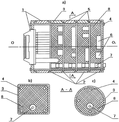 Отвод тепла от плат 6 блока электронной обработки сигнала 2 осуществляется с помощью прокладок 8. Прокладки 8 заполняют весь свободный объем между внутренними стенками секций 3 корпуса, а также установленными внутри секций 3 корпуса пластинами 5 с закрепленными на ней платами 6 электронной обработки сигнала и задними стенками соседних пластин 5. Прокладки 8 выполнены из эластичного теплопроводящего изоляционного материала, которым, например, является двухкомпонентный теплопроводящий изоляционный заливочный компаунд фирмы «НОМАКОН». Секции 3 корпуса в плоскости, перпендикулярной его продольной оси, могут иметь как квадратное (см. чертеж, b), так и круглое (см. чертеж, с) сечение.