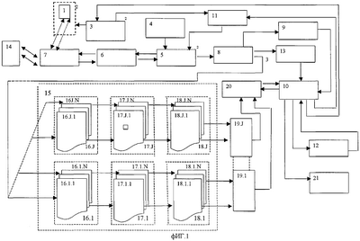 На фиг.1 представлена функциональная схема устройства, где: образец эхо-контрастного вещества – 1, термостат – 2, К-ступенчатый регулятор температуры – 3, генератор – 4, блок формирования J пространственных акустических каналов – 5, коммутатор каналов – 6, ультразвуковой преобразователь – 7, приемник сигналов изображения – 8, частотомер – 9, блок памяти – 10, блок развертки – 11, вычислитель – 12, сканконвертор – 13, диагностируемый орган – 14, многоканальный J·N приемник – 15, J блоков N канальных полосовых фильтров 16.1.1-16.J.N, детекторов 17.1.1-17.J.N, интеграторов 18.1.1-18.J.N, J блоков выбора сигнала максимальной амплитуды 19.1-19.J, блок сравнения – 20, монитор – 21.