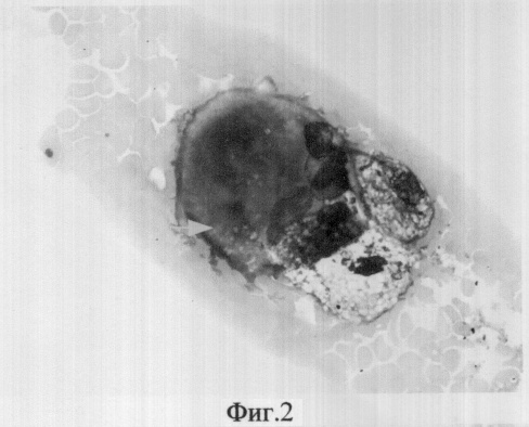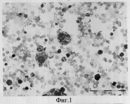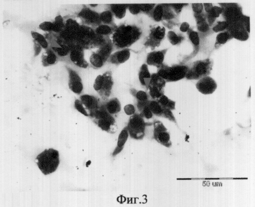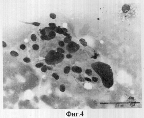 Через 14-21 день после сеанса лазерного воздействия осуществляют пункционную тонкоигольную аспирационную биопсию под ультразвуковым контролем веерообразным методом. При этом используется малотравматичная игла G 0,6, что делает метод более щадящим, не снижая диагностической ценности цитологического мазка. Веерообразный забор предпочтительнее, т.к. увеличивает вероятность попадания разнообразных клеточных элементов, что полноценнее отражает цитологические особенности. Если на этом этапе наблюдается наличие многоядерных гигантских гистиоцитов, а также реактивные изменения и пролиферация соединительной ткани (реактивное изменение фиброцитов), то это свидетельствует об адекватном ответе ткани на лазерное воздействие (фиг.2 и 3).