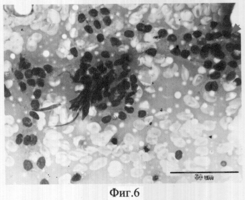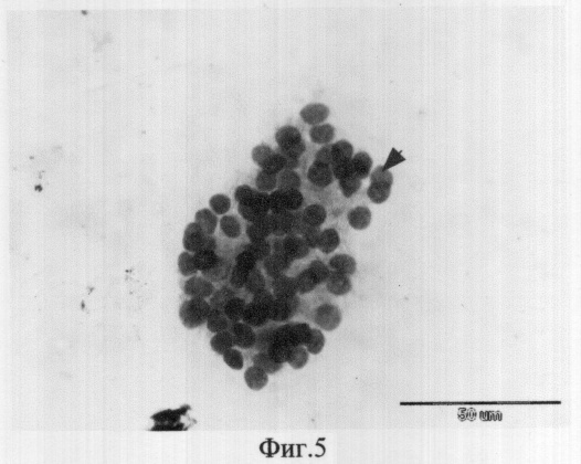 Через 17 дней после лечения выполнена пункционная биопсия с цитологическим исследованием. В материале отмечено появление реактивно измененных многоядерных гистиоцитов (фиг.2), реактивных изменений и пролиферации фиброцитов (фиг.3). Далее, пункционную биопсию выполнили на сроке 4 месяца под ультразвуковым контролем. Исследован полученный материал, в котором обнаружены реактивные изменения клеточного эпителия (фиг.4). Через 7 месяцев пальпаторных данных за узловой объем нет. При эхографическом контроле визуализируется зона неоднородной структуры без четких контуров размерами 7 на 11 мм, из которой получен цитологический материал. По заключению цитограммы обнаружены участки регенерации (фиг.5 и 6). Через 9 месяцев клинических и инструментальных данных за патологию щитовидной железы не получено. Гормональный фон исследован – изменений нет. Лечение проведено успешно.