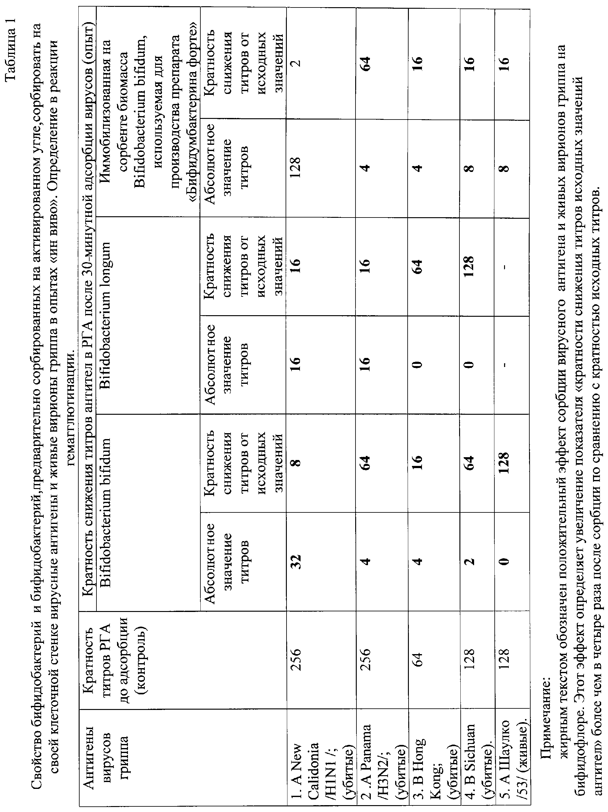 После окончания экспозиции все образцы, в том числе и контрольные, центрифугировали при 2000 об/мин. В опытных образцах культивированная бифидофлора и сорбированная бифидофлора осаждалась, увлекая сорбированные вирусные частицы. Надосадок использовали в определениях титров вирусов в реакции гемагглютинации (РГА). Учет результатов реакции проводили через 30 минут и через 24 часа, при этом показателем взаимодействия являлось падение титра вирусов в надосадке, где бифидофлора отсутствовала.