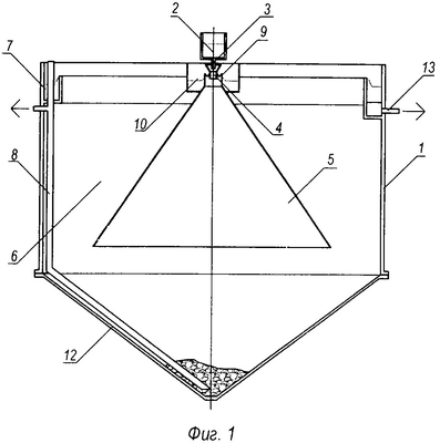 Загрязненная жидкость с раствором химических реагентов по подающему лотку 2 транспортируется на сопло 3 эжектирующей насадки 4 (фиг.3), где в результате истечения жидкости происходит подсос из атмосферы воздуха, вследствие чего образуется водовоздушная смесь, плотность которой меньше плотности уплотненных плавающих веществ. При движении пузырьков воздуха в толще слоя уплотненных плавающих веществ происходит вытеснение его некоторого объема, и далее избыток уплотненных плавающих веществ через зубчатый водослив 9 поступает в сборный лоток плавающих веществ 10, откуда по трубопроводу удаления плавающих веществ 11 транспортируются за пределы вертикального отстойника. Далее очищаемая жидкость с раствором реагентов поступает в вихревую камеру хлопьеобразования 5, где перемешивание воды происходит при ее движении сверху вниз вследствие уменьшения скорости движения при увеличении площади живого сечения по высоте, благодаря чему происходит образование агрегативных частиц в виде хлопьев, которые частично осаждаются и поступают в конический корпус 12, откуда периодически удаляются за пределы вертикального отстойника по трубопроводу удаления осадка 8 под гидростатическим давлением. Другая часть агрегативных частиц в виде хлопьев, имеющая меньшую гидравлическую крупность, проходит плоскость направляющей окружности вихревой камеры хлопьеобразования 5, где в результате изменения направления потока происходит наиболее интенсивное разделение твердой и жидкой фаз. Далее очищаемая жидкость снизу вверх поступает в слой взвешенного осадка 6, ограниченный поверхностями цилиндрического корпуса 1 и вихревой камеры хлопьеобразования 5, где площадь живого сечения является величиной переменной и, как следствие, будет переменной скорость восходящего потока. Так как гидравлическая крупность коагулированных взвешенных веществ есть величина переменная, то по высоте слоя взвешенного осадка 6 будут образовываться слои взвешенных веществ с определенной гидравлической крупностью, причем максимальная критическая гидравлическая крупность коагулированных частиц будет наблюдаться в нижней части слоя взвешенного осадка 6, а частицы с минимальной критической гидравлической крупностью будут концентрироваться в верней части слоя взвешенного осадка 6. В результате многообразного рода взаимодействий (броуновского движения, сил Ван-дер-Ваальса, ионных связей и т.д.) при поступлении воды в слой взвешенного осадка 6 будет происходить адгезия частиц коагулированной взвеси, их укрупнение и, как результат, увеличение гидравлической крупности. При достижении максимальной критической гидравлической крупности коагулированных частиц в слое взвешенного осадка 6 они будут осаждаться и далее поступать в конический корпус 12 вертикального отстойника, откуда периодически удаляться под гидростатическим давлением по трубопроводу удаления осадка 8 за пределы. Частицы с гидравлической крупностью, меньшей минимальной критической гидравлической крупности, будут выноситься из слоя взвешенного осадка 6 вместе с осветленной водой, далее поступать в лоток осветленной воды 7 и затем по трубопроводу удаления осветленной воды 13 будут удаляться за пределы вертикального отстойника. Плавающие вещества, поступающие с очищаемой жидкостью и имеющие плотно
