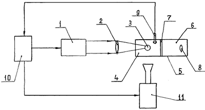 На чертеже показана функциональная схема устройства для получения мощных ультразвуковых импульсов. Оно содержит импульсный лазер 1, который через фокусирующую линзу 2 концентрирует свое излучение в ограниченной области 3 генераторной среды 4, которая находится в сосуде 5, вторая половина которого заполнена передающей ультразвук средой 6, отделенной от первой половины перегородкой 7, и в которой находится облучаемый ультразвуком объект 8. В генераторной среде 4 находится датчик температуры 9, который соединен с устройством управления 10, управляющие входы которого соединены с импульсным лазером 1 и лазером непрерывного действия 11, луч которого также направлен на генераторную среду 4. Устройство для получения мощных ультразвуковых импульсов работает следующим образом.