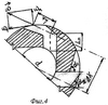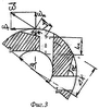 Выходные каналы (фиг.3 и 4) имеют участок постоянного сечения Lп и диффузорный участок Lд протяженностью 0,5…1,5 длины участка постоянного сечения. Угол наклона стенок, образующих диффузорную зону, составляет 10…85° к оси выходных каналов. На фиг.3 приведено сечение канала, в котором одна стенка диффузорного участка параллельна оси участка постоянного сечения, а другая направлена под углом к ней по направлению тангенсальной составляющей потока. На фиг.4 приведено сечение канала, в котором две стенки диффузорного участка под разными углами 1 и 2 к оси участка постоянного сечения. Причем 1> 2.