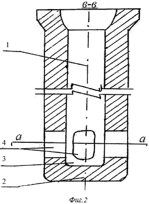 Сущность изобретения поясняется чертежами, где на фиг.2 изображен погружной стакан; на фиг.3 и 4 – варианты выполнения разреза «а-а» фиг.2 выходных каналов; на фиг.5 – схема движения металла в поперечном сечении кристаллизатора.