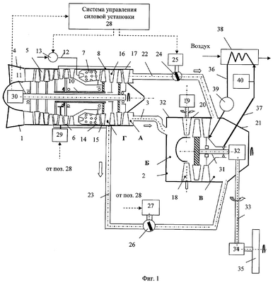 Свободная турбина 2 содержит регулируемый сопловой аппарат свободной турбины 18 с приводом 19, рабочее колесо свободной турбины 20 и реактивное сопло 21. На входе в свободную турбину 2 выполнена полость «Б», а на выходе из свободной турбины – полость «В». Газовый тракт 3 соединяет выход из газотурбинного двигателя 1, т.е полость «А», со входом в свободную турбину 2, конкретно с полостью «Б» на входе в свободную турбину 2.