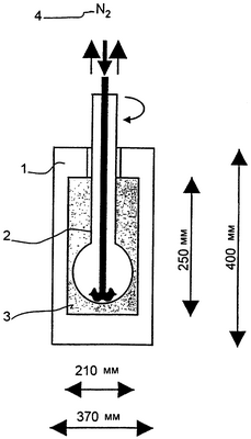 200 г этих колец по две порции в 100 г последовательно кальцинируют во вращающейся шаровой печи из кварцевого стекла 1 л внутренней емкости согласно чертежу (1 – корпус печи, 2 – вращающийся поршень, 3 – обогреваемая камера, 4 – поток азота/воздуха). Для этого содержимое вращающейся печи нагревают в потоке воздуха 50 нл/ч с линейной характеристикой нагрева в течение 27,5 мин от 25 до 275°С и эту температуру при сохранении воздушного потока поддерживают в течение 1 часа. Затем в течение 32,5 минут нагревают с линейной характеристикой от 275 до 600°С, причем воздушный поток заменяют потоком азота в 50 нл/ч. Температуру 600°С и поток азота сохраняют в течение 2 часов и всю печь оставляют охлаждаться до 25°С с сохранением потока азота. Получают черные таблетки следующего состава: MO1,0V0,33 Te0,15, Nb0,11, Ox.