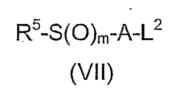 где R4 является таким, как определено выше, за исключением водорода, OR7, OR8 и OR9, и L1 обозначает удаляемую группу, обычно галоген и, предпочтительно, хлор или йод, в случае реакций алкилирования, или предпочтительно хлор, в случае реакций ацилирования. Эту реакцию обычно проводят в присутствии основания, такого как гидрид натрия, в растворителе, таком как диоксан, тетрагидрофуран или N,N-диметилформамид, при температуре от 0 до 100°С (предпочтительно, 0-50°С). Согласно следующему частному случаю данного изобретения, соединения формулы (I), где R1, R2, R3, R4, R6, W, A, m и n являются такими, как определено выше, и R5 является таким, как определено выше, за исключением водорода, могут быть также получены взаимодействием соединения формулы (VI):